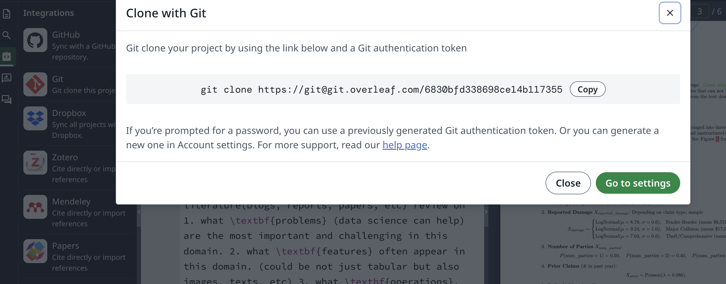 Ve a overleaf.com/user/settings → Git integration → crea o copia tu token.