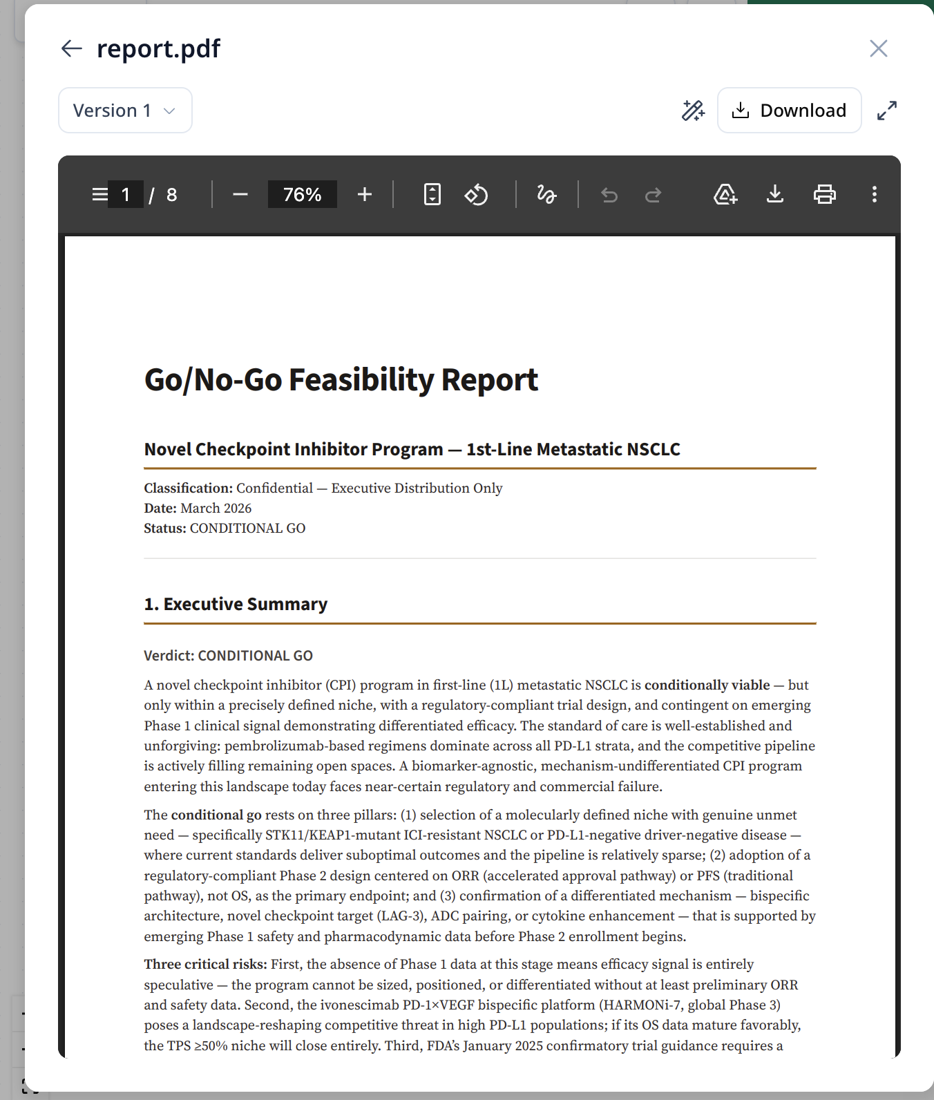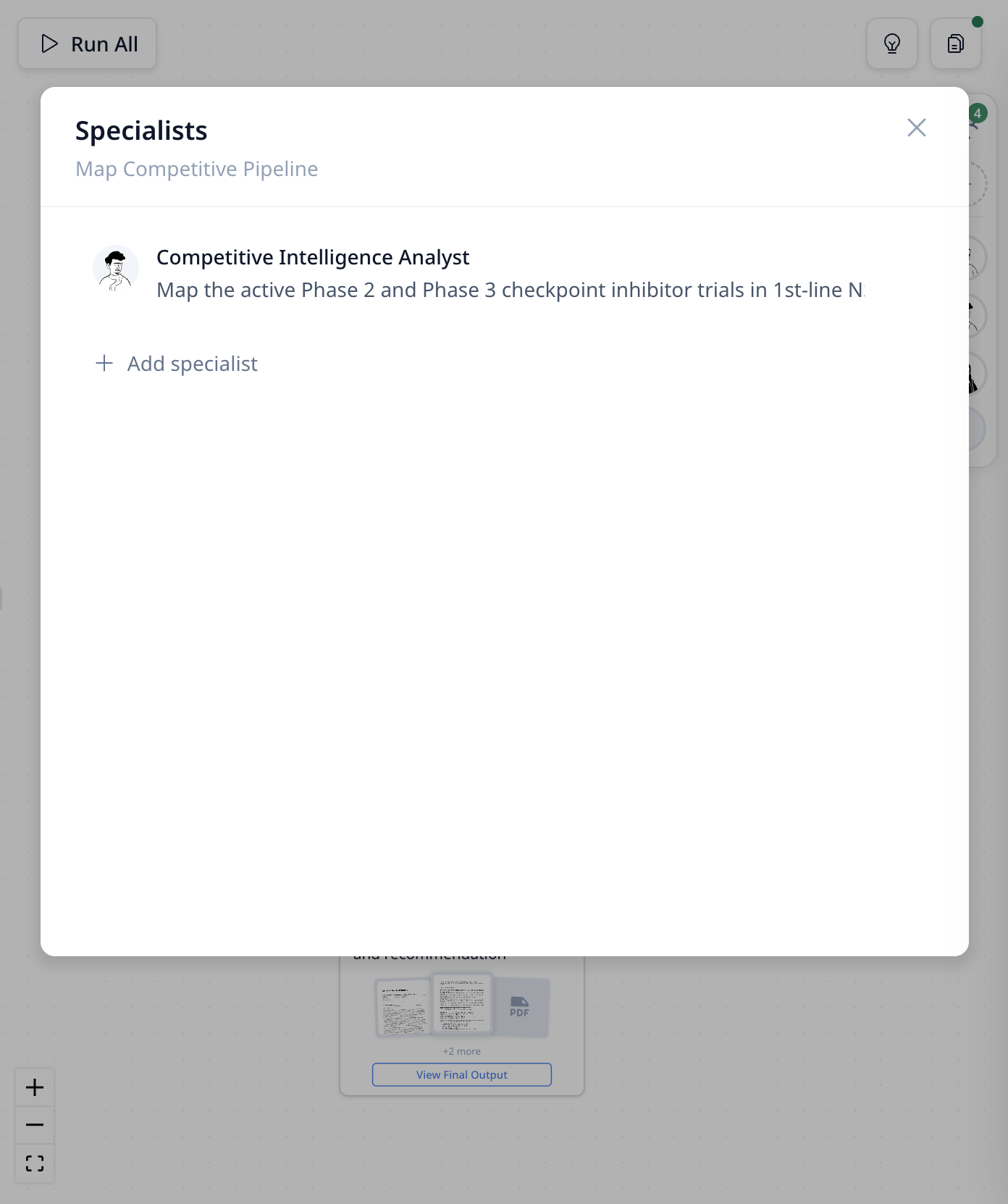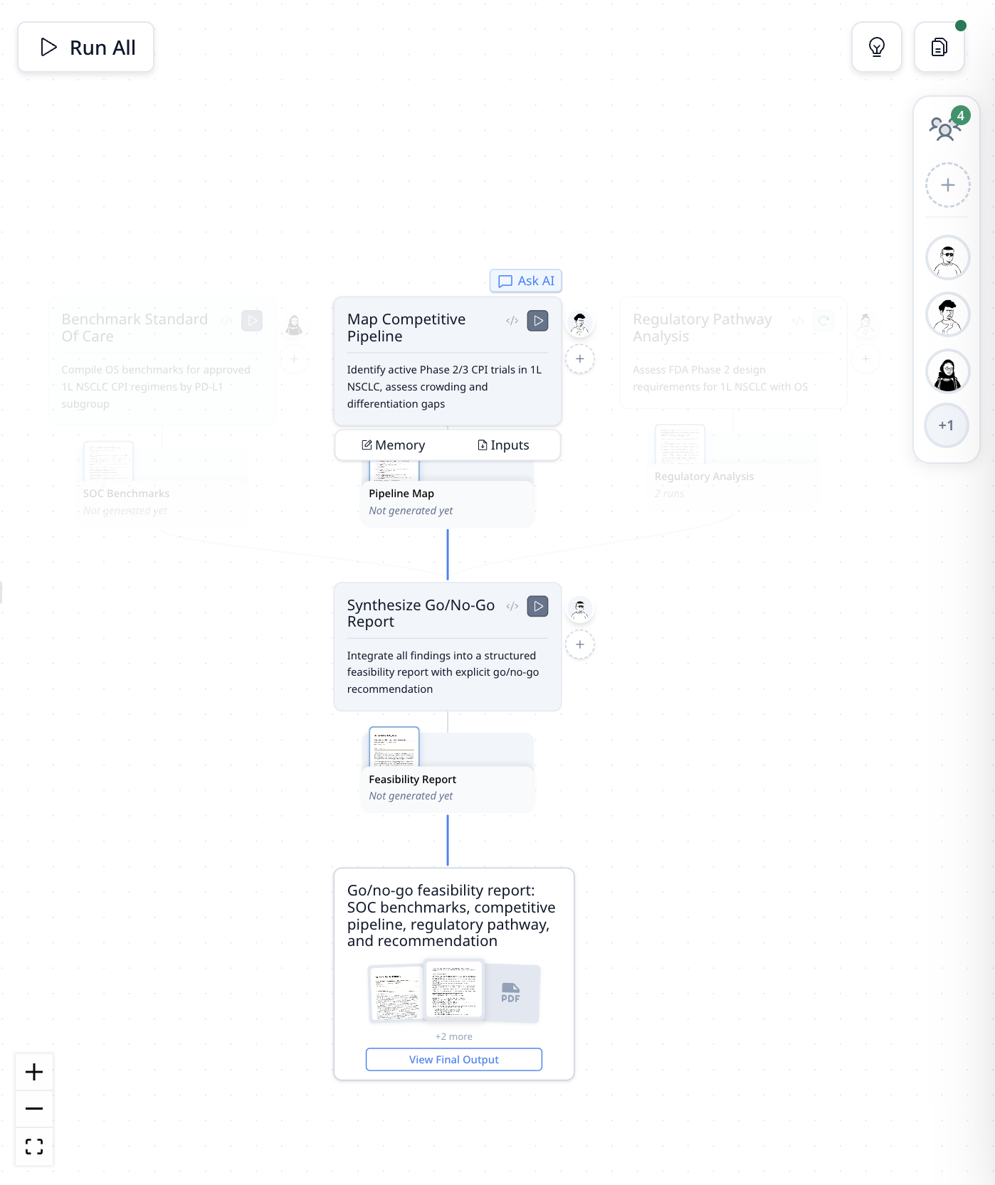 Panel derecho — Lienzo de Flujo de Trabajo: Visualiza el flujo de trabajo del proyecto como pasos visuales. Cada tarjeta es una tarea que el especialista puede ejecutar — como "Mapear Pipeline Competitivo", "Análisis de Vía Regulatoria" o "Sintetizar Informe Go/No-Go".