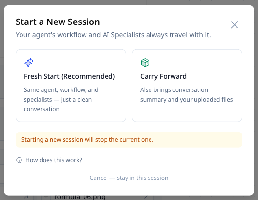- Fresh Start — Mantén el mismo agente y especialistas; el historial de chat y los archivos permanecen en la sesión actual.
