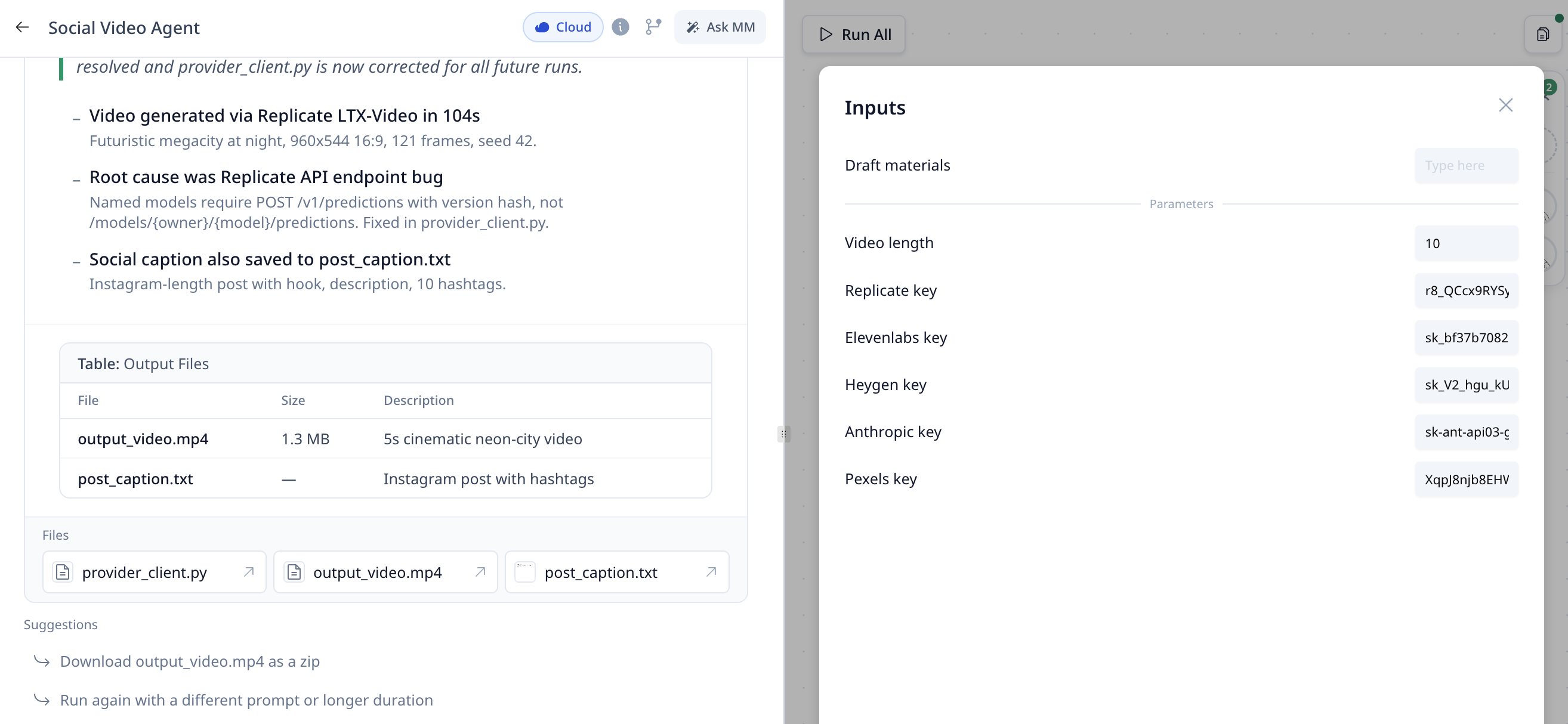 Por ejemplo, un Social Video Agent puede conectarse a Replicate (video), ElevenLabs (voz), Heygen (avatares), Anthropic (escritura) y Pexels (stock) — todo en un mismo flujo, con cada clave proporcionada una sola vez en el panel de Inputs.