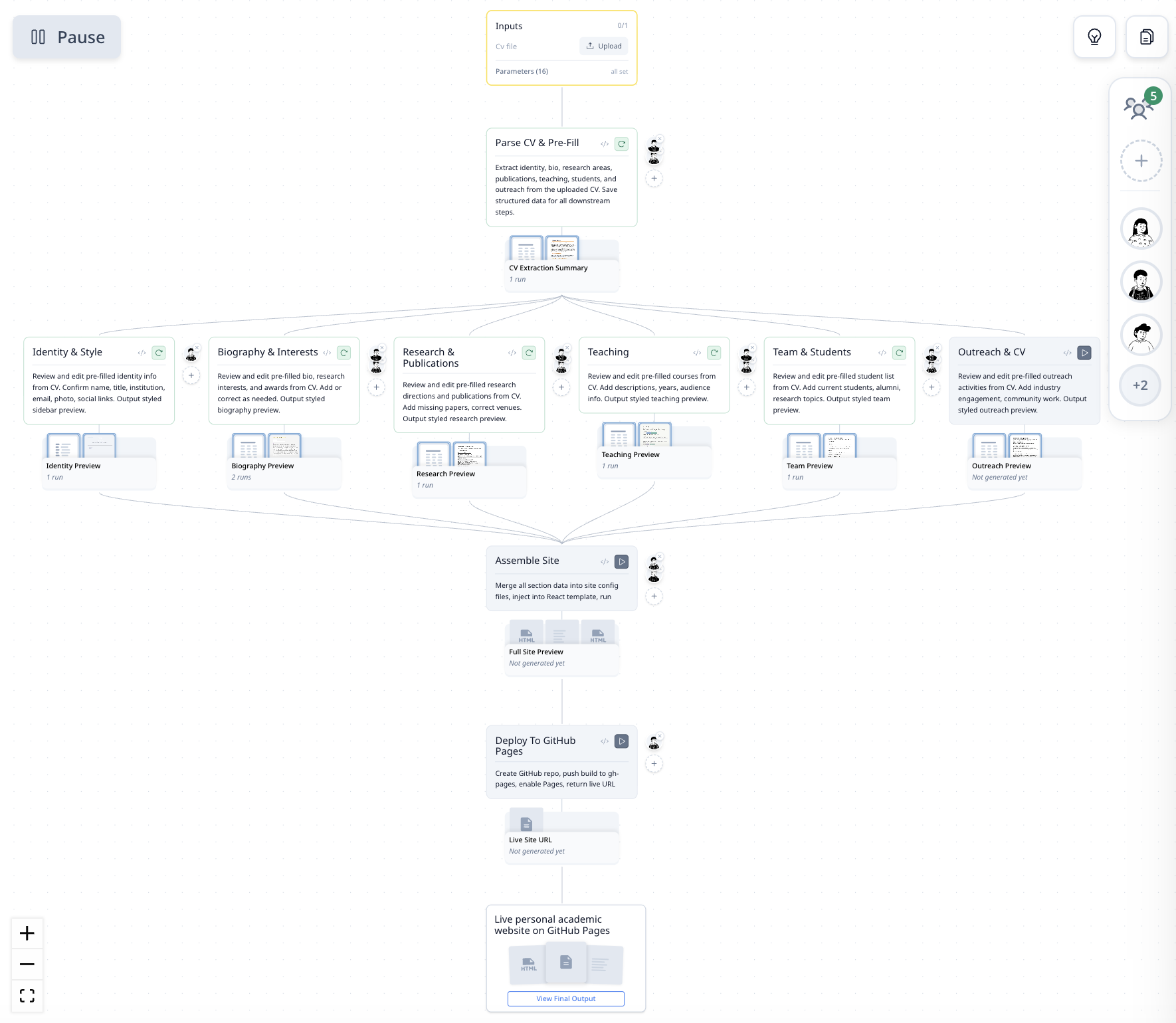 Yes. This agent parses your CV (PDF), extracts structured data for each section (bio, publications, teaching, team), and lets you review and edit each section with styled previews before assembling and deploying the site.