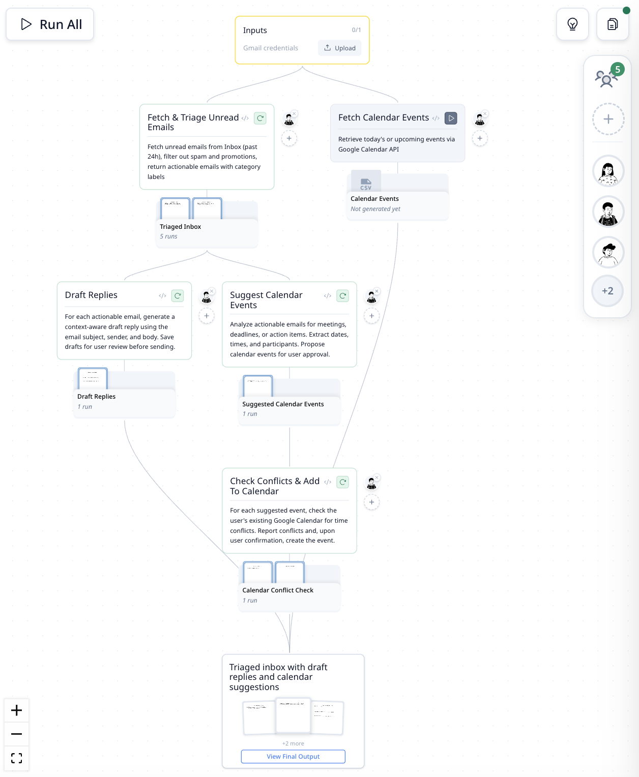 두 번의 대화형 요청. MorphMind는 Gmail 리더로 시작했고, 사용자가 일정 이벤트에 대해 질문하자 에이전트가 즉시 일정 단계를 추가했습니다 — 재시작이나 재구성 없이. 전체 5단계 워크플로우는 사용을 통해 확장되었습니다.
