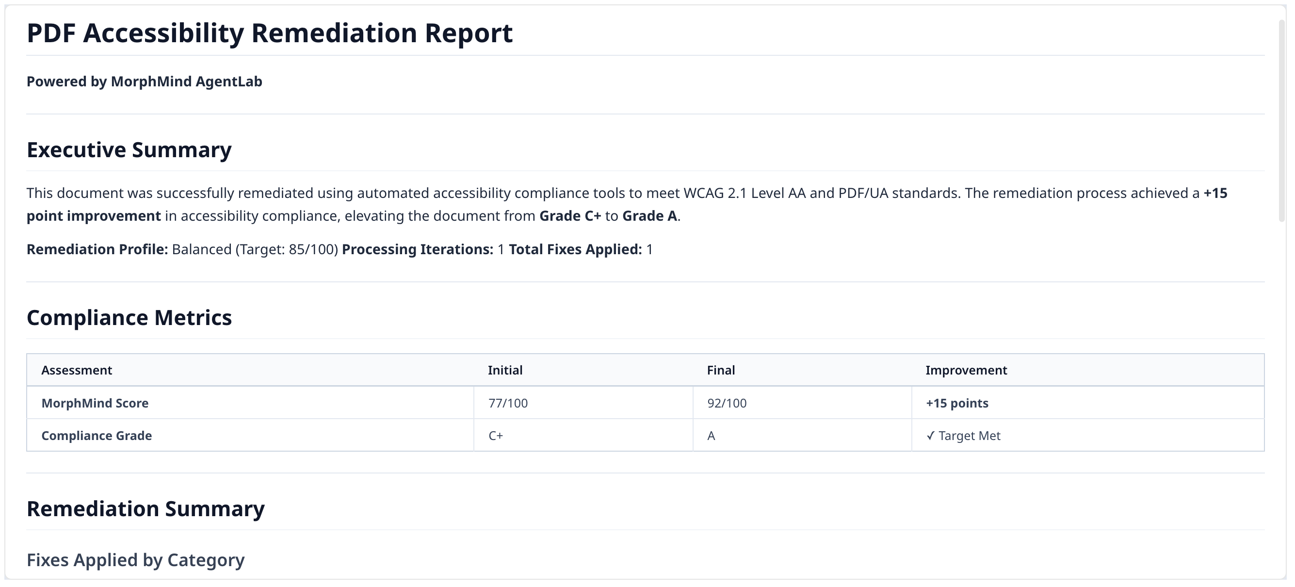 一句话加上一个文件上传。MorphMind 构建了 8 步修复管线,将其连接到后端无障碍服务,并配置了合规评分——可以处理任何 PDF。