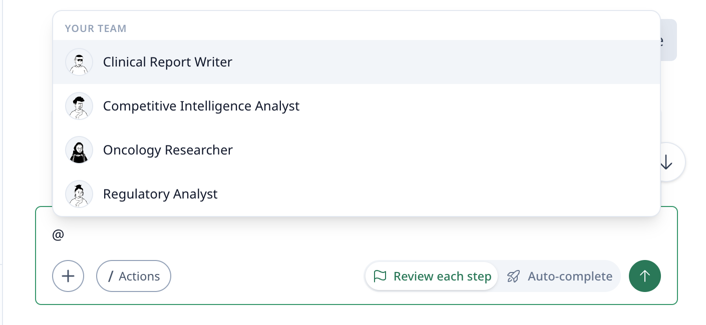 右侧面板 — 工作流画布: 以可视化步骤查看项目工作流。每张卡片是专家可以执行的任务——如"绘制竞争管线"、"监管路径分析"或"综合决策报告"。